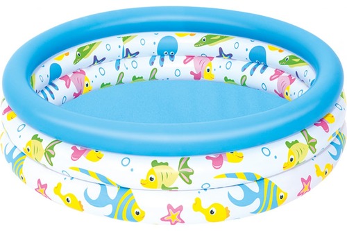 Бассейн легко надувается и устанавливается на любой ровной поверхности.