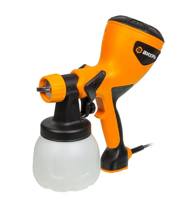 Конструктивно Вихрь ЭКП-400 состоит из горизонтально расположенного двигателя, встроенной системы распыления HVLP, бака для ЛКМ с нижним расположением и рукояти с противоскользящим покрытием. Мощности электрического краскопульта в 400 ВТ достаточно, чтобы обеспечить производительность до 0,7 л/мин. Бачок объемом 0,8 л требует частой заправки, но облегченная конструкция в сочетании с удобной прорезиненной рукоятью не утомляет руку во время работы.