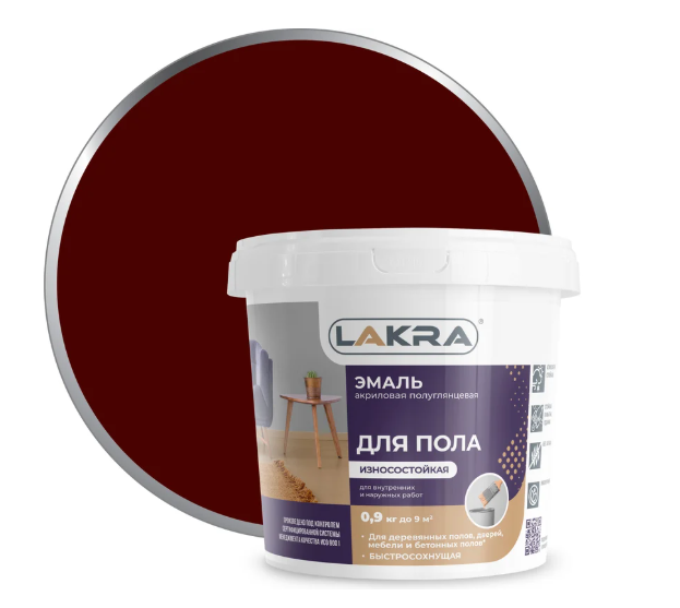 Акриловая эмаль для пола Лакра красн-коричневая, 0.9 кг  используется для покраски деревянных, бетонных полов, а также дверей и мебели. Покрытие обладает защитными и декоративными функциями, отличается влагостойкостью и износостойкостью.
