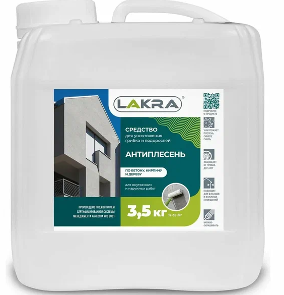 Средство Антиплесень Лакра 3.5кг.Средство для уничтожения плесени, грибка, водорослей, синевы.Высокоэффективное средство для уничтожения и профилактики возникновения плесени, грибка, синевы и большинства видов бактерий на бетонных, кирпичных, деревянных и любых других поверхностях, обладающих впитывающей способностью. Для влажных помещений и наружных работ на обработанные средством поверхности необходимо нанести сверху финишное покрытие различными видами ЛКМ, обеспечивающими защиту подложки от попадания воды.Область применения: Для наружных и внутренних работ в жилых помещениях и помещениях с повышенной влажностью: ванные комнаты, подвалы, погреба, парники и т.п., а также в качестве добавки к меловым, гипсовым и цементным растворам. Подходит к нанесению на деревянные, древесно-стружечные и древесно-волокнистые материалы, бетонные, кирпичные или оштукатуренные поверхности. Предотвращает развитие микроорганизмов в строительных материалах бактериальной и грибковой природы на срок до 5 лет.Подготовка поверхности: Поверхность должна быть сухой, чистой, не обработанной пленкообразующими и водоотталкивающими материалами.Температура окружающей среды — выше 5 °С.Минеральные поверхности: очистить механически от осыпающихся и непрочных фрагментов (с помощью струйной обработки, проволочной щетки, шпателя).Затем обрабатываемую поверхность прогреть и высушить (с помощью паяльной лампы, строительного фена).Новая древесина: гладкие поверхности отшлифовать, тщательно очистить от пыли и загрязнений.Старая древесина: посеревшие, ветхие деревянные поверхности отшлифовать до здорового слоя и тщательно очистить.Инструкция по применению: Наносить на поверхность кистью, валиком или распылителем 1-3 слоя. Для уничтожения плесени и грибка использовать средство в неразбавленном виде. Для профилактики появления плесени и грибка допускается разведение препарата водой в соотношении 1 часть препарата на 1-2 части воды.Для внутренних и наружных работ.