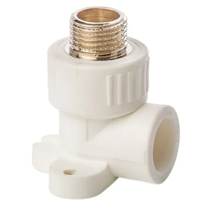 Угольник комбинированный с креплением PP-R, наружная резьба, предназначен для подсоединения к полипропиленовому трубопроводу сантехнического смесителя или другого компонента инженерной системы с резьбовым подключением.