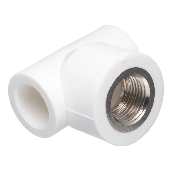 Трехсторонний металлопластиковый фитинг для подсоединения к полипропиленовому трубопроводу компонента инженерной системы с резьбовым подключением.