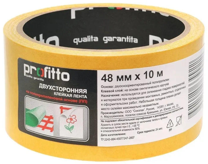 Клейкая лента двухсторонняя 48мм х 10м полипропилен PROFITO