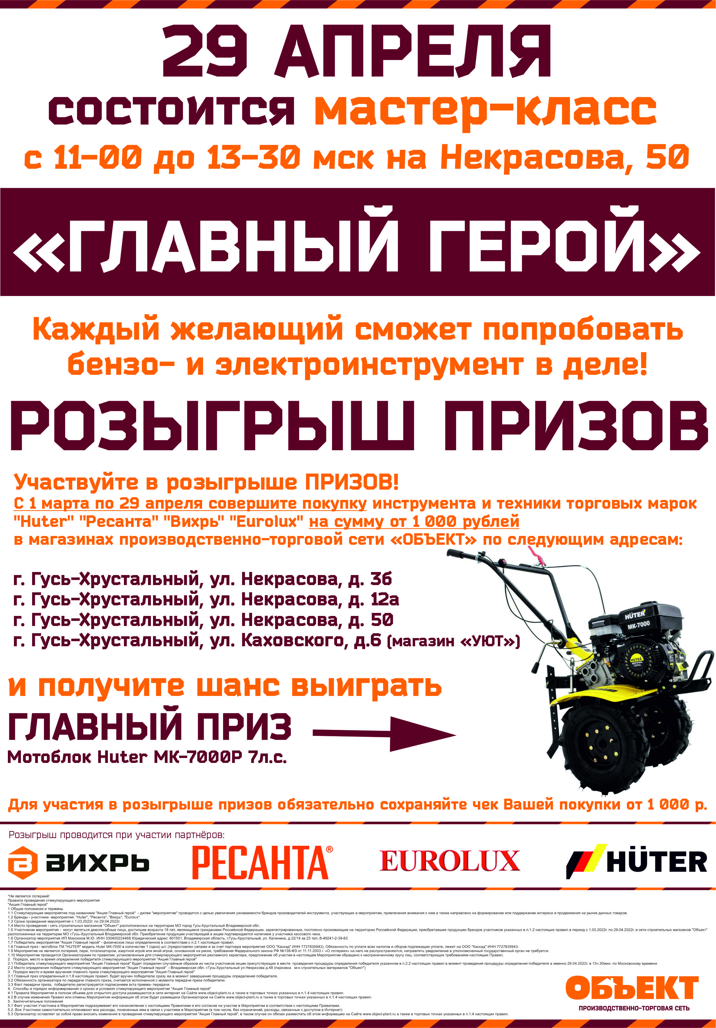 Для участия в розыгрыше приза, совершите покупку с 01.03-29.04 инструментов ТМ "Huter", "Ресанта", "Вихрь","Eurolux", в сети магазинов "Объект" в г. Гусь-Хрустальный.